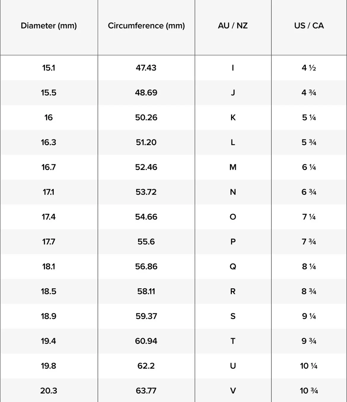For the highest accuracy head to your local jeweller and they will be able to measure your ring size for free. Alternatively you can measure a ring that fits the desired finger. Place the ring against a ruler and carefully note down the diameter and match it to the chart below. Keep in mind each mm can shift a ring size